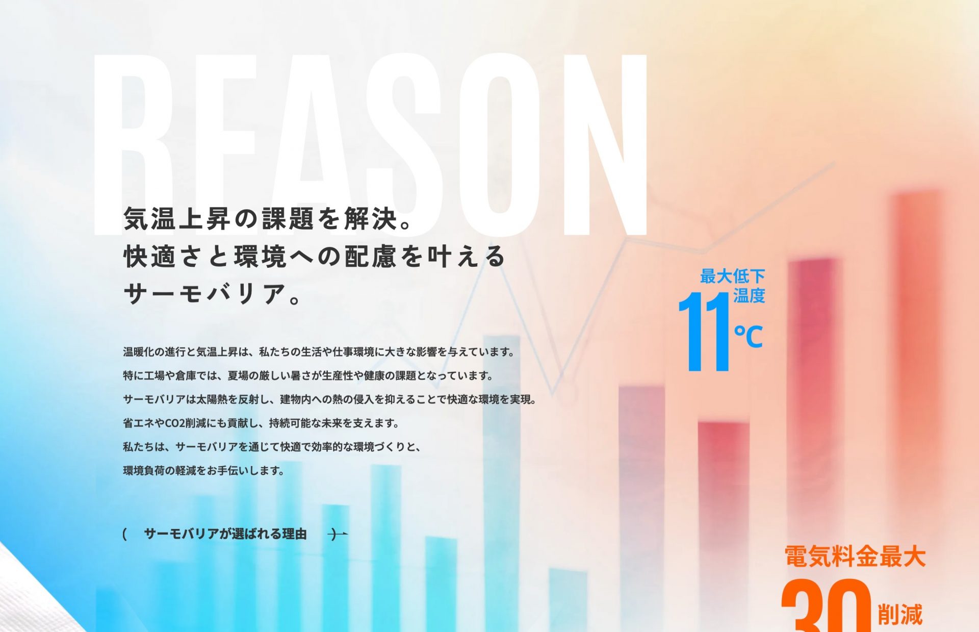 企業サイトは、主力商材「サーモバリア」を中心に、商社営業マンが営業現場で活用できる“トークスクリプト”として機能する構成を構築。導入効果や販売事例を体系化し、「この商材は売れる」と直感的に感じてもらえるストーリーラインを設計しました。デザイン面では、遮熱技術の先進性を伝えるクリーンで力強いビジュアルと誠実なトーンを両立。製品だけでなく、企業としての信頼性と専門性を伝えるサイトに仕上げました。