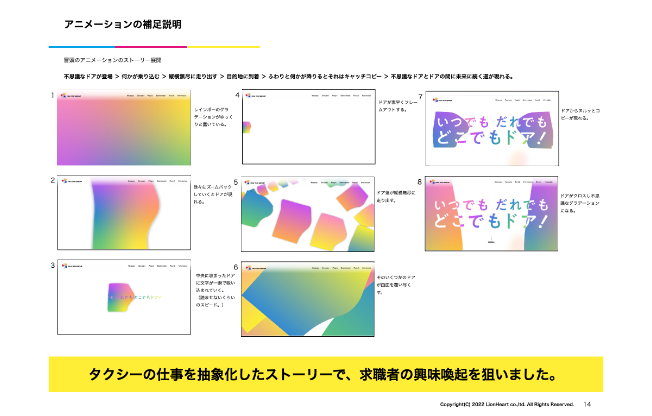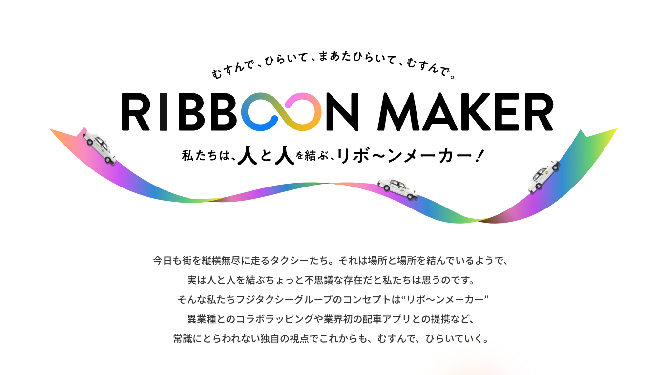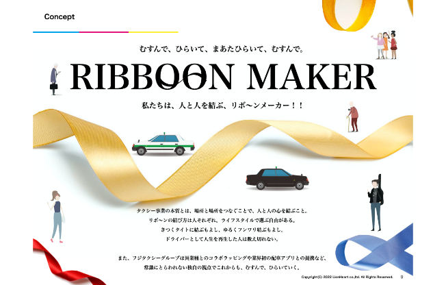 その後、ドライバー経験者である役員の方々を中心にしたプロジェクトチームとの打ち合わせを重ね、企画を練る中で、コンセプトとして「RIBBOON MAKER」をご提案。高齢化が進むタクシー業界の中で、先進的な取り組みを続けているフジタクシーグループらしさを若者に直感的伝えることを意図しました。表現の核となるビジュアルとメインコピーについては複数案を検討する中で、最終的にはタクシー事業の本質、経歴も年齢も大きく異なる人々が働く現場の多様性(ダイバーシティー)、どんな人でも受け入れ育てる企業としての懐の深さ(インクルージョン、包摂性)を表現するものに辿り着きました。